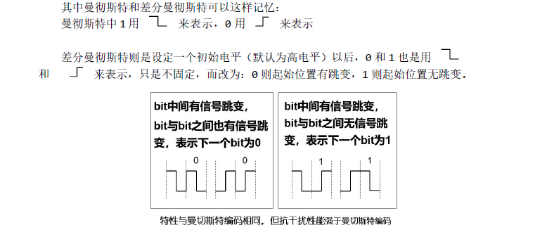 注意:两种曼彻斯特编码的1、0 位的定义没有严格的要求,可以与上图表示的相反,只要在过程中完全一致即可