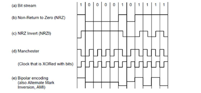 问题:带宽效率低;较多连续的0 或1 导致接收方无法分辨每个比特。不归零逆转(NRZI,non-return-to-zero):0 时信号不发生变化,1 时信号跳变。
