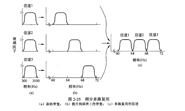 频分复用(FDM,Frequency Division Multiplexing) 利用通带传输的优势使多个用户共享一个信道。它将频谱分成几个频段,每个用户完全拥有其中的一个频段来发送自己的信号。