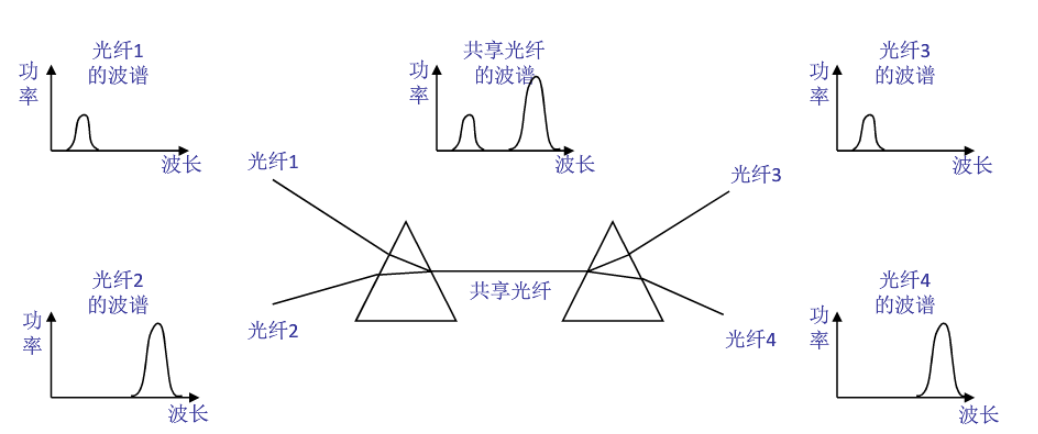 波分(WDM,wavelength division multiplexing)是频分多路复用的一种,利用光纤信道的巨大带宽,同一光纤可以同时传输一组不同波长的光信号,并且不会互相影响。简单来说就是光的频分多路复用。