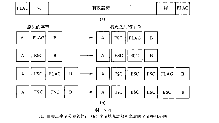 发送方使用标志字节(FLAG)作为开始和结束;使用转义字节(ESC)表示其后的字节为数据字节而不是标志字节或转义字节。接收方将收到的数据中的转义字节删除后再传递给网络层。