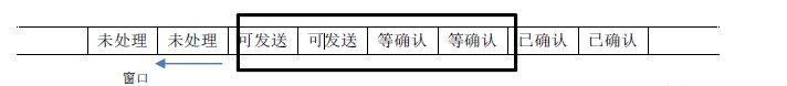 滑动窗口(sliding window):为了便于理解,可以认为数据是一条传送带,而滑动窗口中的数据是当前准备处理的数据。一旦窗口的第一条数据被确认处理结束,窗口就会继续向后滑动以处理后面的数据。下面是发送方的发送窗口形象化的表示: