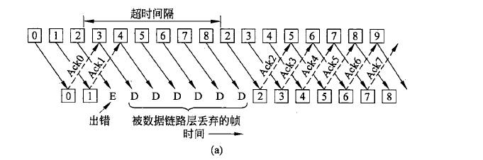 而因为接收窗口大小为1,除了数据链路层必须要递交给网络层的下一帧外,接收方拒绝接受任何帧。如果在计时器超时以前,发送方的窗口已被填满,则管道将变为空闲,最终,发送方将超时,并且按照顺序重传所有未被确认的帧,从那个受损或者丢失的帧开始。