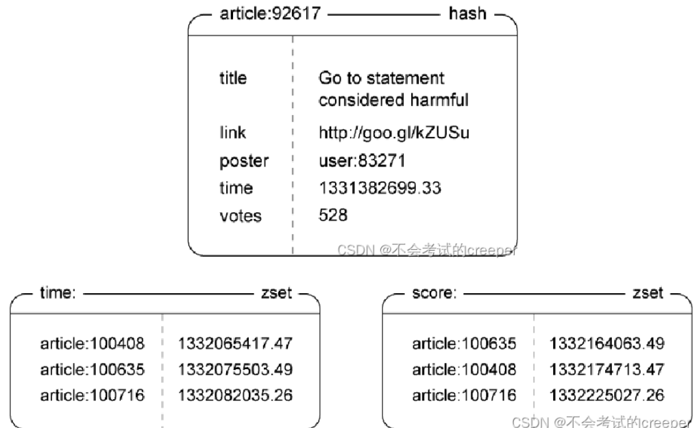 它是不需要事务的,存文章信息的格式为 article: 文章ID ——hash,hash里存各种键值对信息【这意味着文章间信息联系弱,因为没有跨文章的事务】