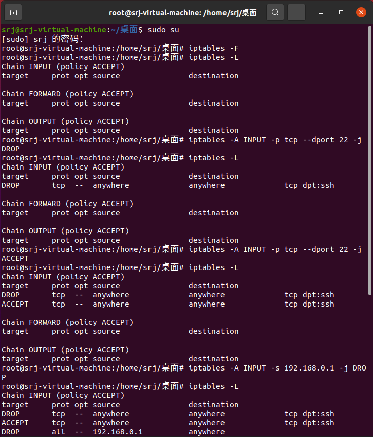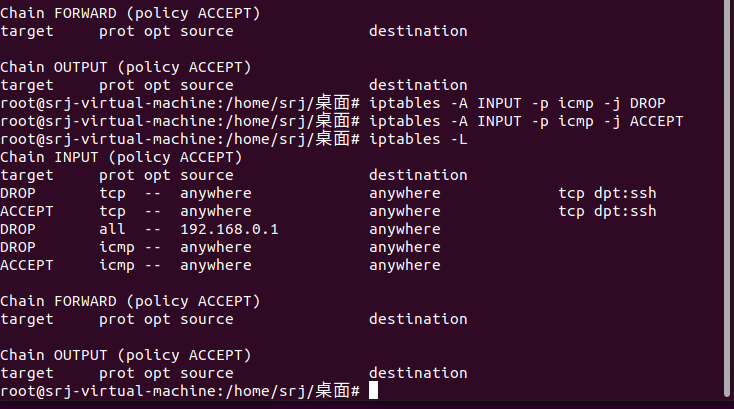根据实验要求以及有关命令,分别对22端口、192.168.0.1ip、icmp协议进行关闭和开放,结果如下图