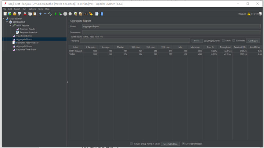根据聚合报告的结果,在执行了1000次请求的测试中,服务器表现出良好的稳定性和效率,平均响应时间为183毫秒,但个别请求的响应时间仍有较大波动。整体来看,服务器性能稳定。